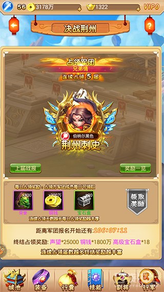 参与决战荆州的全部玩家均可以获得丰厚奖励,即使是失败方也有奖励。占领方军团成员每天可以在决战荆州活动页面领取一份占领奖励(荣誉、铜钱、宝石盒)。而新加入军团的玩家则在加入军团后第二日可领取奖励。