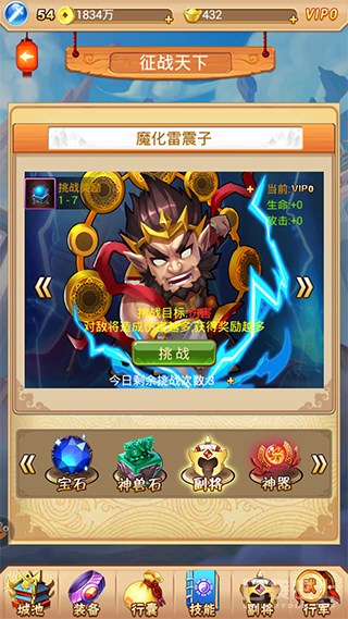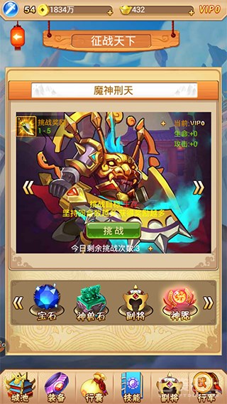 《开心挂三国》中,玩家们点击征战天下,即可进入世界BOSS挑战界面。进入界面之后,玩家们可以根据世界BOSS的掉落奖励,挑选自己想要挑战的BOSS并挑战。游戏中,玩家们挑战魔神刑天可以获得神器奖励,挑战魔化雷震子可以获得副将相关道具奖励,挑战魔化土妖可以获得神兽石奖励。除此之外,游戏中玩家们挑战其他世界BOSS,还可以获得神速符、铜钱、宝石等火爆道具奖励!