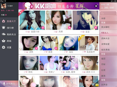 KK唱响在ipad上使用,屏幕更大,直播更有fell,随时随地让唱炫你的喉咙。KK唱响除了视频K歌外,你还能展示i、魔术等才艺,也可以和美女聊天视频非常有趣哦!