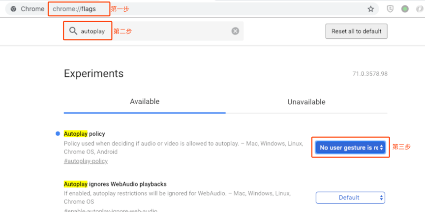 第三步:将 “Autoplay policy“ 一项设置为 “No user gesture is required”